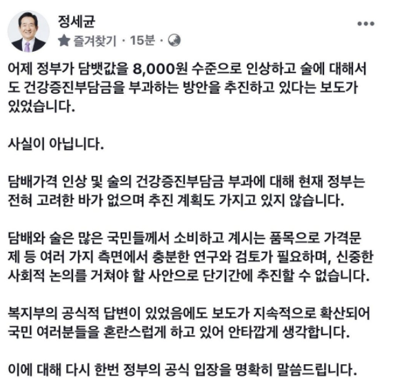 현재 담뱃값 인상에 대한 말이 돌았는데 정세균 국무총리는 sns를 통해 이가 사실이 아님을